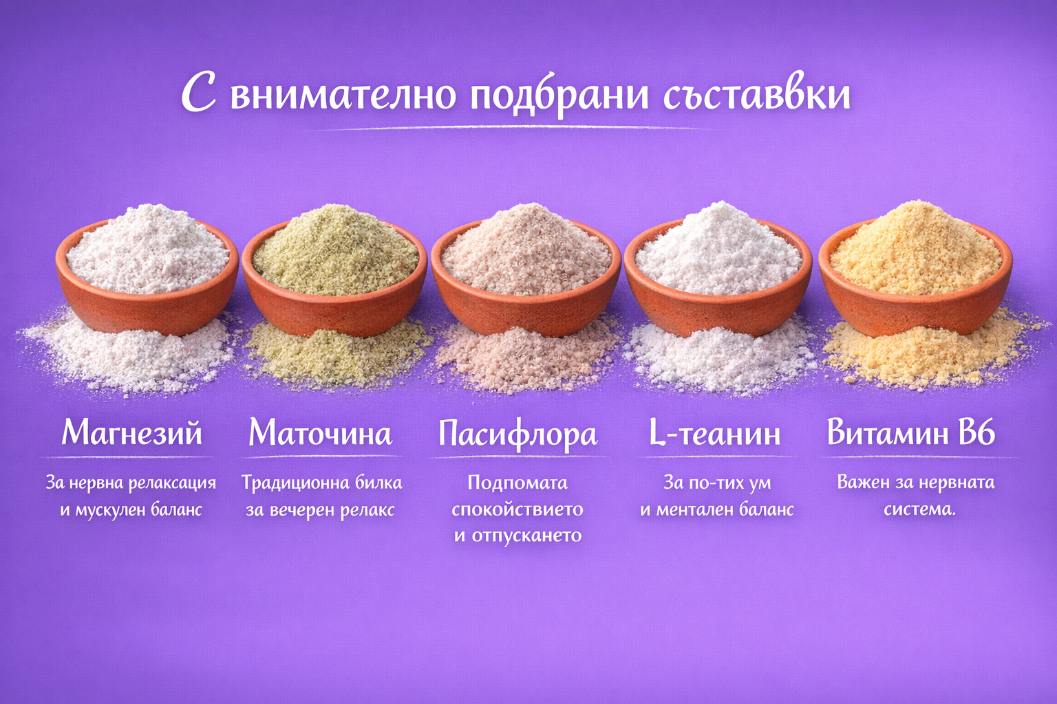 Формулата комбинира магнезий, L-теанин, маточина, пасифлора и витамин B6 – съставки, които работят в синхрон, за да подпомогнат нервната система и вечерното отпускане.